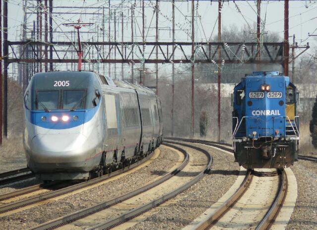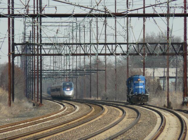 | Normally, even with the apparent head start, Conrail SAA light engine move FJ10 on Track 1 would not stand a chance along side the approaching Acela Express on Track 3. |