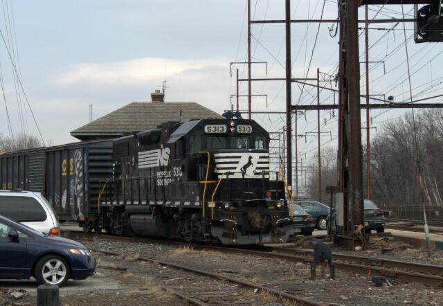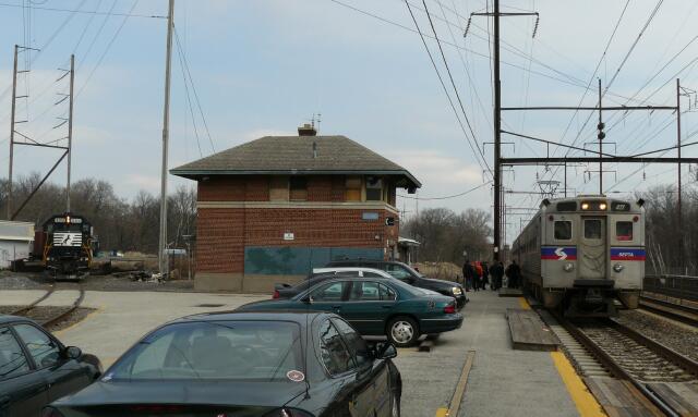 | A little later, FJ10's brother, FJ4, sits at Holmesburg Junction on the Bustleton Branch on the other side of Holmes Tower from where SEPTA R7 local 738 is making its stop. Unlike FJ10 however, FJ4 needs to cross over all tracks to get over to the 0 Track, and it will sit waiting for a window between both eastbound and westbound traffic. |