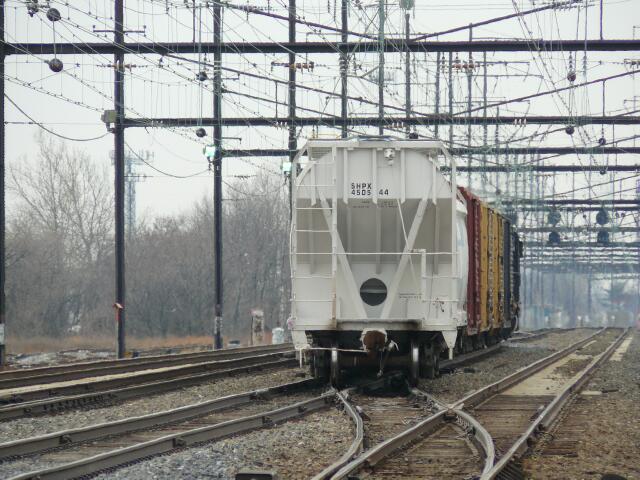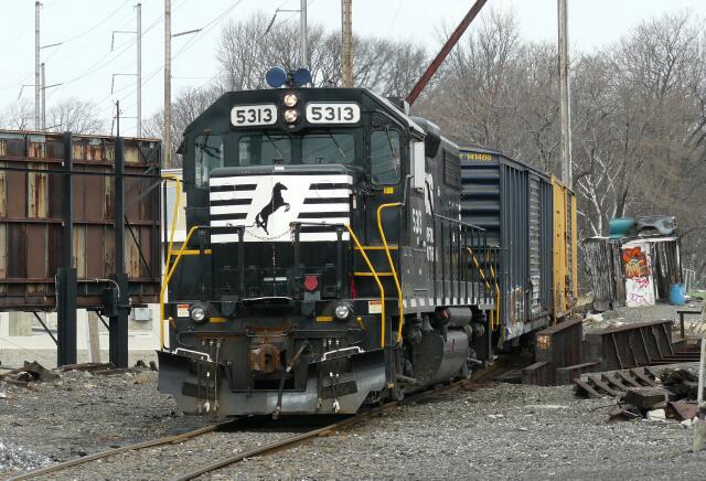 | Nothing says urban rustbelt setting like lots of utility poles, rusty billboards, abandoned siding bridges and the ubiquitous junkyards littered with burned car fenders and wrecked trailers. The clean paint on NS GP38-2 5313 (former PC/CR 8131) looks out of place among the decay. |