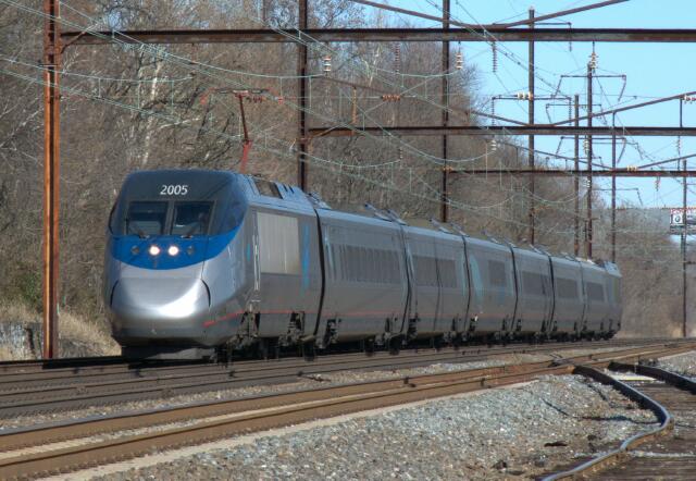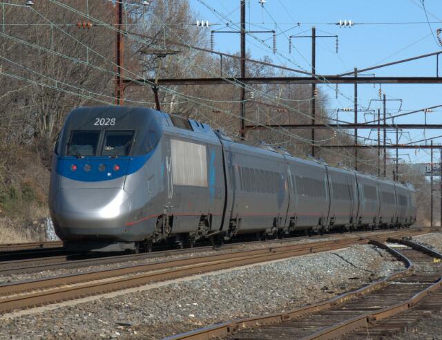 | First up Acela Express 2160 with trailing power car 2028 sporting the most common version devoid of red body striping, name or logo. |