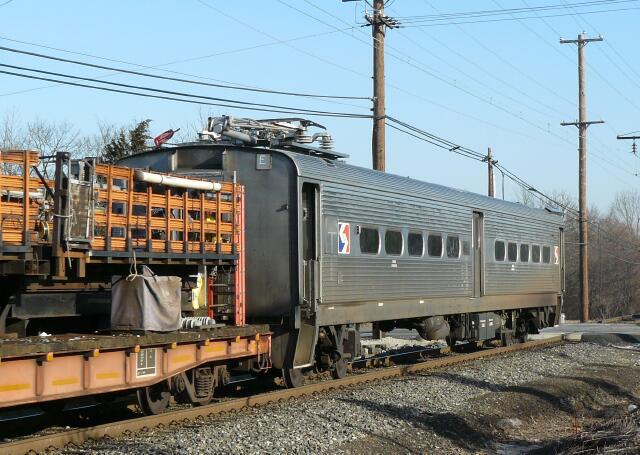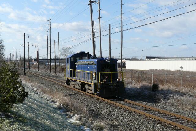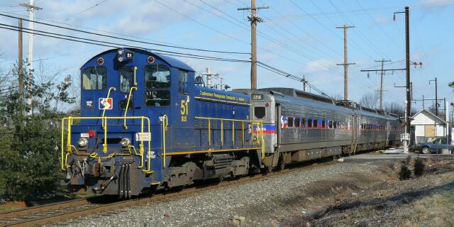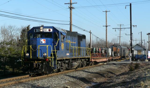 | On December 22 2008, a three car set in Doylestown woke up dead, and at first SEPTA was going to dispatch the wire train to get it and bring it back into town, but then decided to send Extra 51 up instead. Here 51 is heading east on the Doylestown Branch passing the old American Olean Tile plant. |
