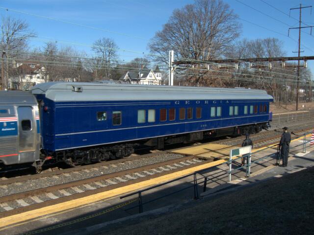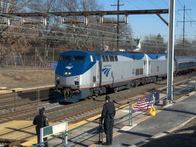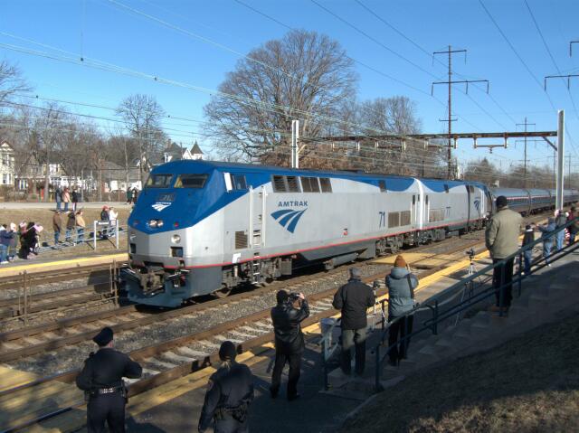 The Saga of Norwood Arrived at Norwood Station, just south of Philadelphia, at 10:00. Temperature hovering around 20 degrees, less in the ample shade. There were about a dozen people there already, including a half dozen photographers. Also there were at least a half dozen local and SEPTA police officers around the station area. The photo line, with police permission, was set up at the north end of the inbound platform. On the scanner, overhearing interesting conversations about the different "orders" that police are enforcing up and down the line (you can stand on the platforms but not on the overpass, you can stand on the overpass but not past this point, no parking on the inbound and outbound sides, it's ok to park on the inbound but not the outbound). We feel lucky because MARC had closed ALL of its stations except Edgewood. About 10:20 an Amtrak catenary and track inspection car, reportedly with Secret Service in the cab, comes south on Track 2 and a military helicopter follows overhead. Shortly after that the police approach the photographers and say they have been advised to clear the platforms on both sides of the tracks. Probably had something to do with all the facial hair displayed by the photographers. The crowd retreats back behind the railing of the ramps that lead to the platforms, about 3 feet from where they were previously, and police put up yellow tape to keep them back. Passengers show up for Train 4610, scheduled to depart Marcus Hook inbound at 10:48, but it does not arrive at the designated time and is assumed held. Pilot train with P42's 54 and 100, Heritage special service car AMTK 10020 "Pacific Command" and track geometry car AMTK 10002 "Corridor Clipper" comes south on Track 2 about 11:10. Later a helicopter that appeared to be from Homeland Security passes overhead and shortly after that we are advised by police that the goal posts have moved again. They have been instructed to clear ALL people from the inbound side and that we should all go over to the outbound side. They are told to hurry as the train is now imminent. Unfortunately I have six cameras on tripods all over the place, so I am one of the last to move. With half the cameras packed, I have an idea and ask if I can start the cameras rolling and then leave them, and I am told yes. Less than a minute after I start the cameras I hear "Here it comes!" At 11:55 The Obama Express with P42's 44 and 120 (44th President to be inaugurated on January 20), nine Amfleet cars (five coaches and four cafe cars) and heavyweight observation car "Georgia 300" rolls through. Candidate Obama had used "Georgia 300" on a campaign trip from Philadelphia to Harrisburg during the primaries in April 2009. Afterwards crowd begins to disperse but police are not sure if that was the train. Several calls are placed to various parties, and responses are conflicting: That was the train, that was a decoy train, he hasn't left 30th Street, he is on his way, some people don't answer their phones. At 12:10 the press/protect train appears, powered by P42's 71 and 77 and pulling four Amfleets (three coaches and a cafe car) and Amtrak observation car AMTK 10001 "Beech Grove". Still no definitive answer until minutes later when a civilian on the phone says her sister is watching CNN and Obama is in Claymont DE. |
