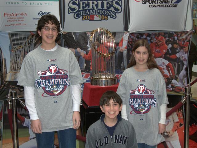 | The highlight of the day was to come. Raced home in time to see the Phillies World Series trophy, pictured here with my kids, on its tour stop at the Montgomery Mall. Presidential inaugurations happen every four years, Phillies World Series wins ... not so regular. |