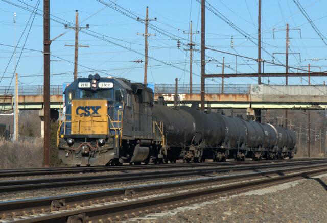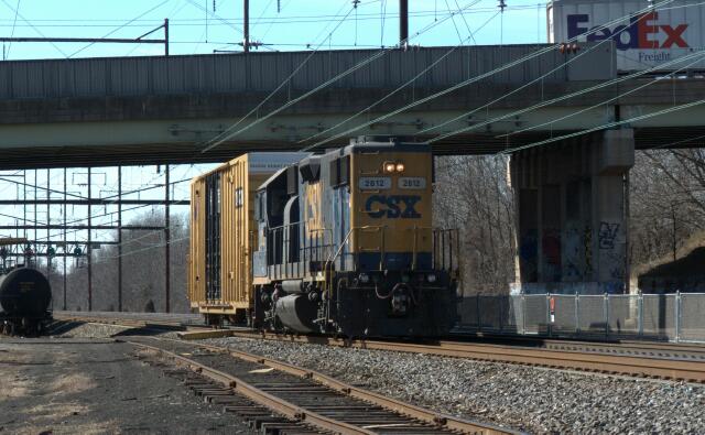 | CSAO FJ10 with CSX GP38-2 2812 (former CR 8278) pulls a single high cube box car past a string of tank cars at Eddington siding. |