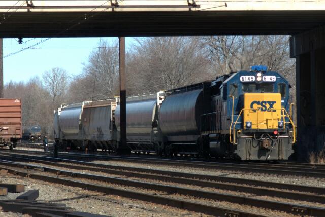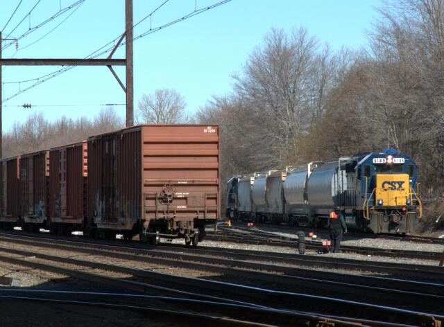 | CSX C770 coming off the Fairless Branch is ready to head down to Nabisco with five covered hoppers, but first it has to do a favor for Q418 sitting on the main. |