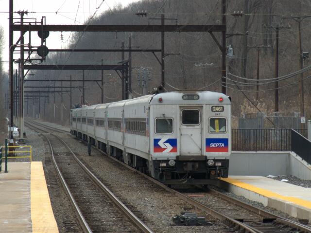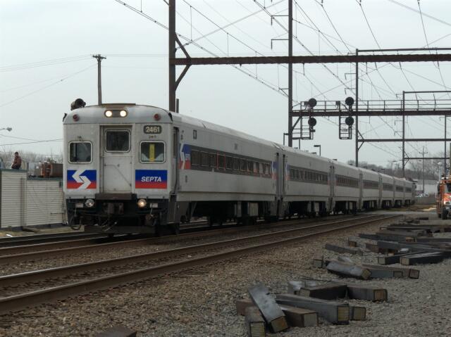 | Usually only moving during rush hour, the push-pull sets occasionally make midday excursions for training purposes, such as this run through Langhorne with SEPTA cab car 2461 leading. |
