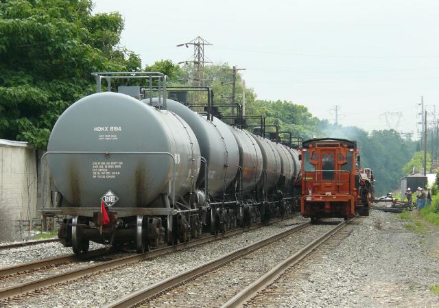| NS Black SW1001 2101 is paired with Conrail Blue SW1500 2222 on H25 as it pulls a string of tank cars through Bridgeport PA down to the Falls on NS Harrisburg Line Track 1. |