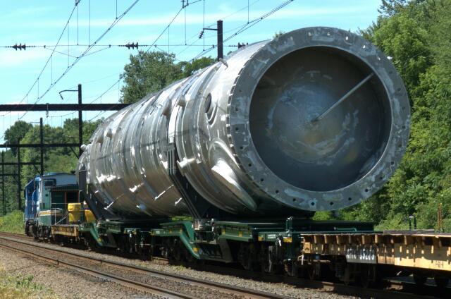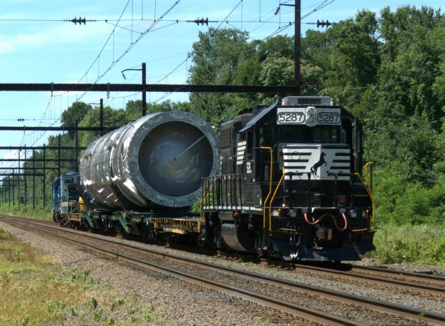 | After a lull of many months, it looks like Air Products in Lehighton has started cranking out the big loads for overseas customers again. Having traveled the NS Lehigh Line as NS 052 earlier in the week, this weekend's high and wide load is now on the CSX Trenton Line as CSX W982 and a CSX crew with NS GP38-2 5296, still in Conrail paint but sans class lights, leading with an Air Products caboose and a couple of TTX spacer flats. |