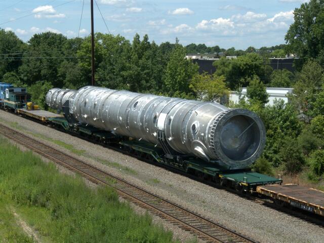 | The center of attention is of course the load, spread across two depressed center flat cars. |