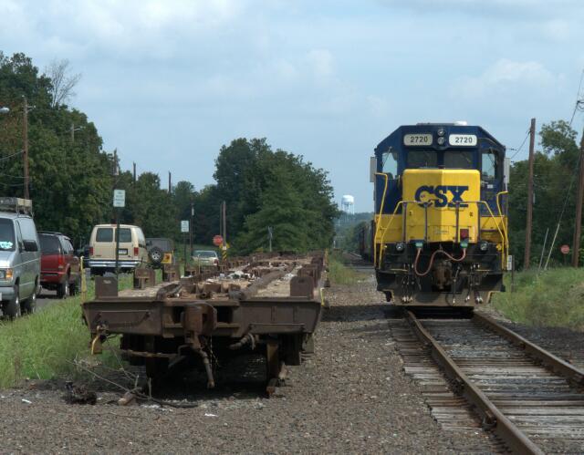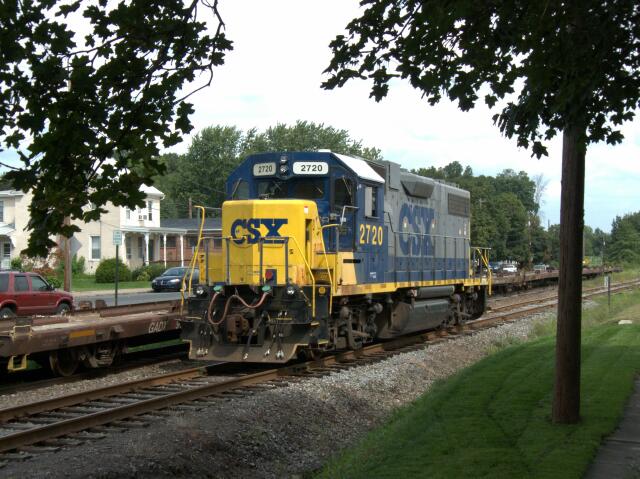 | After working the Bethlehem Branch up from Lansdale, the crew of CSX B738 takes lunch in Telford, parking GP38-2 2720 just north of County Line Road. |