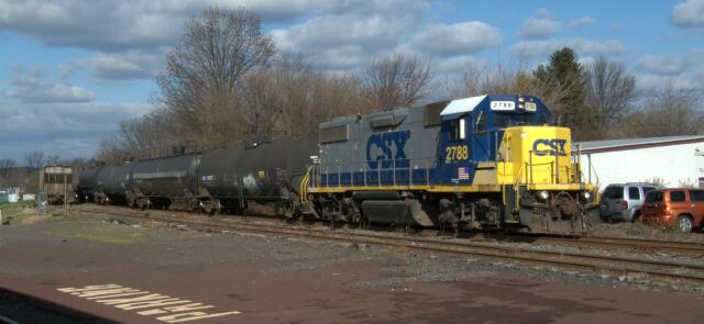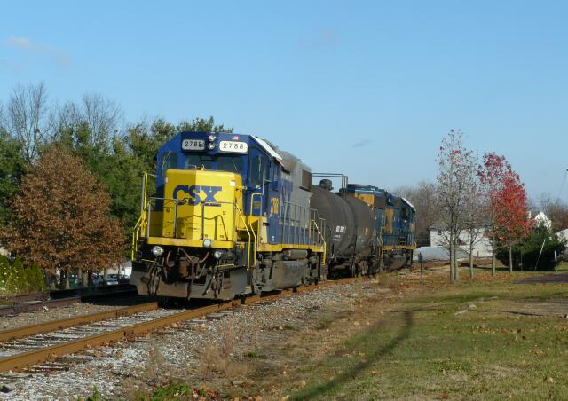 | CSX B738 pulls into Telford with GP38-2S 6237, GP38-2 2788 and an empty tank car as a spacer. Thanks to evergreens and some late falling leaves, there is still a little color left. |