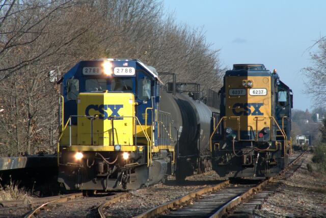 | Everything ready, they are on the move, here passing an empty covered hopper from Moyer Feed at Reliance Road in Souderton. Moyer receives covered hoppers filled with grain destined for local farms and is the northernmost customer CSX switches on the branch. |
