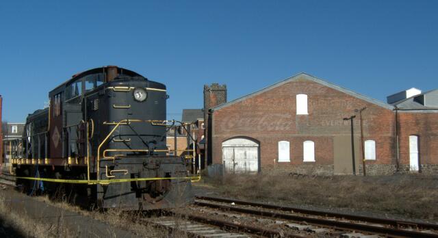 | A forlorn 57 sat just south of the station. Adjacent to the former Reading Company station, the Coca-Cola sign is barely visible on the former Lehigh Valley Transit trolley station. |