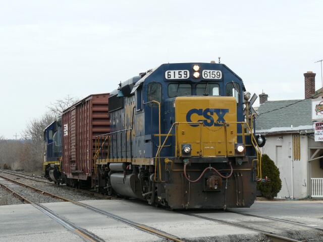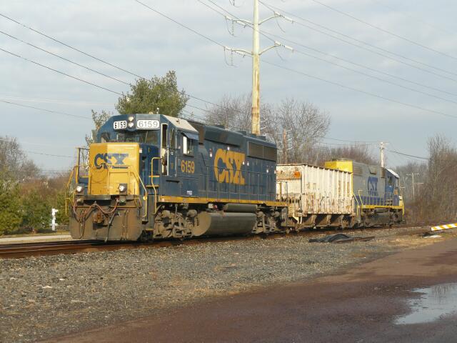 | CSX B738 with a loaded CSX hopper sandwiched between CSX GP38-2S 6159 and GP38-2 2746 just south of Hatfield Station on CSX Bethlehem Branch January 19 2010. |