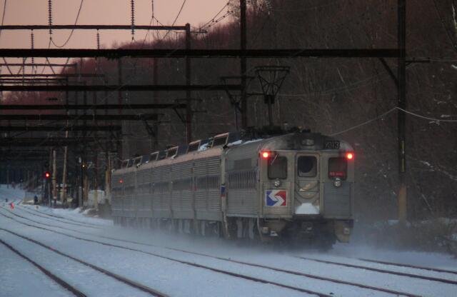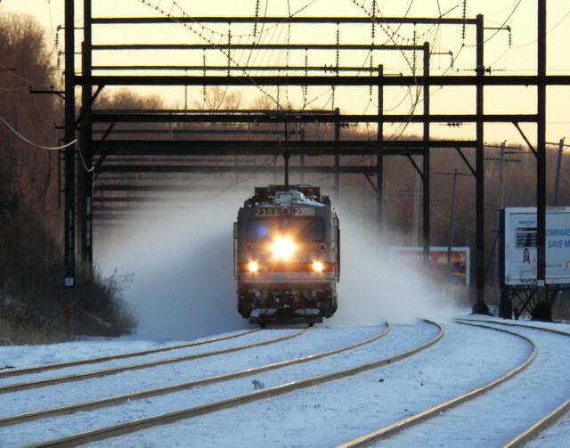 | Speaking of Comets, SEPTA AEM-7 2303 and its Comet brethren Bombardier set on Train 6321 bringing some New Jersey snow to Pennsylvania. |