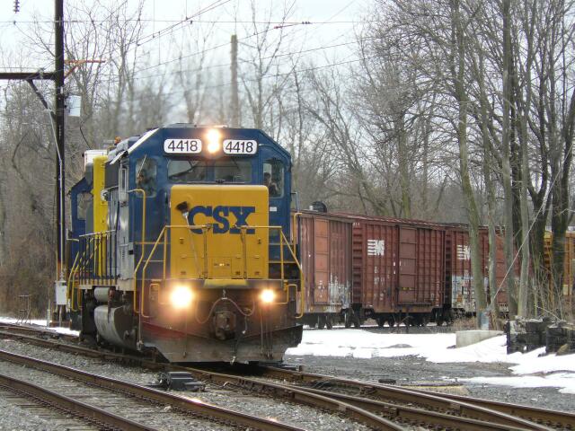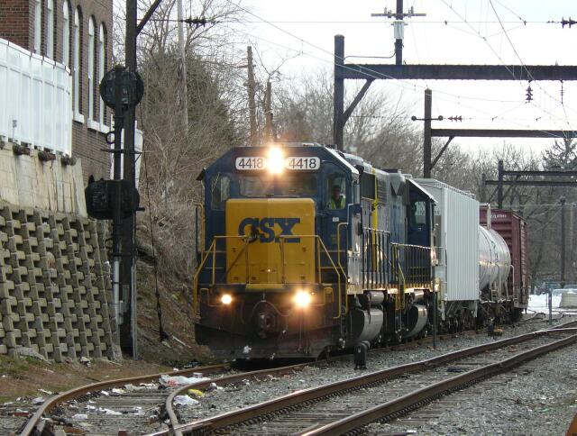 | March 2 2010 sees a daylight run down the Stony Creek for B738 with CSX GP40-2 4418 about to lead GP38-2 2746 and the rest of the train off the branch onto SEPTA's Norristown Line at CP Elm in Norristown. |