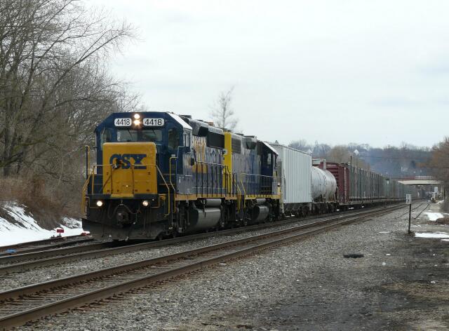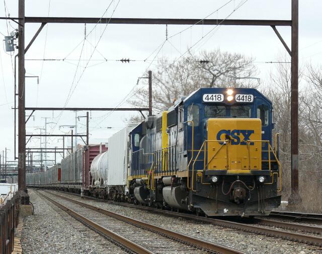 | CSX B738 blasts through Bridgeport on the NS Harrisburg Line heading for South Philadelphia. |