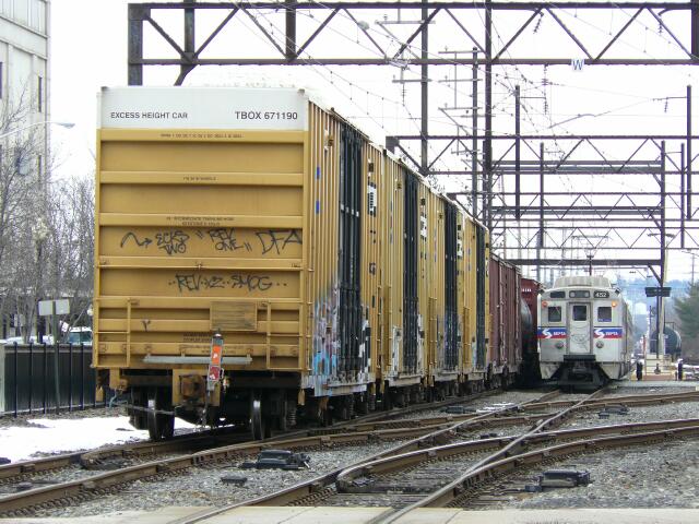 | Prior to the removal of the Blue Line, the main reason for the Stony Creek Branch was to provide a route to Lansdale for high cubes like these which go to customers on the Bethlehem and Doylestown Branches. High cars cannot be taken south of Dale due to wire clearance. |