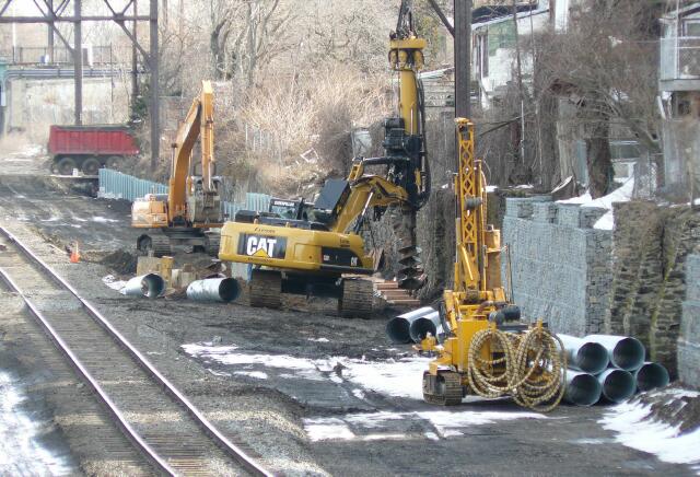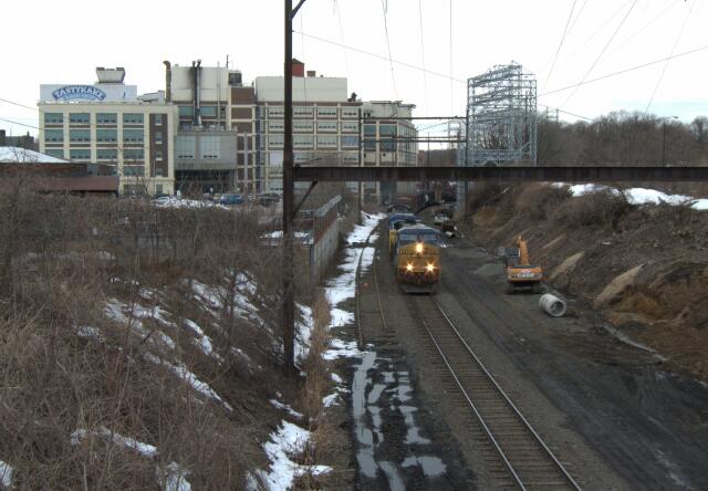 | The doublestack clearance project is in full swing again. So far, the only section completed is the Rhawn Street bridge, and back in December 2008 there was a review of the then-current layout, but now the shovels are in the ground. CSX Q418 crawls through the work area on what is now the single track, as Track 2 has been removed and that area excavated. |
