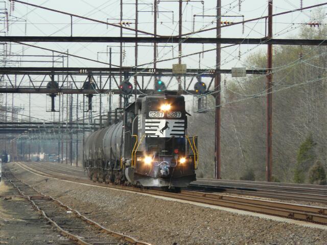 | CSAO FJ10 out of Frankford Junction rolls past the signals at Eddington with NS 5287 as sole power pulling a string of tank cars. |