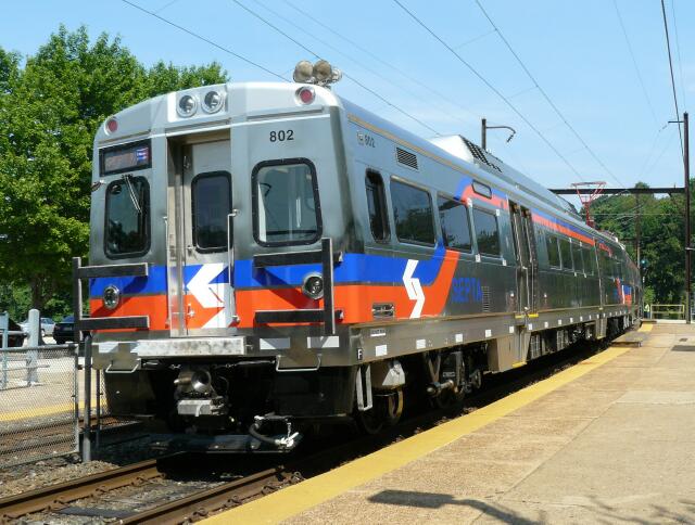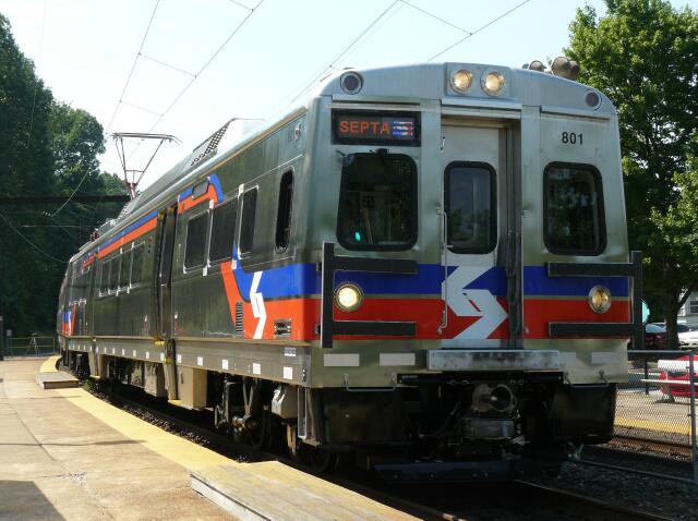 | SEPTA commenced daylight testing of Silverliner V married pair 801 and 802 on June 24 2010. First run up from Wayne Junction was on the Chestnut Hill East Line, pausing here at Washington Lane Station. |