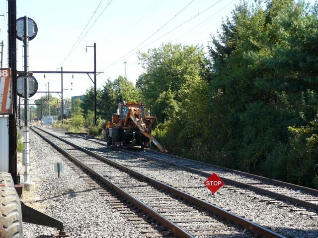 | A Swingmaster sits on what is left of the old Wood Siding, the switch having already been removed over Labor Day weekend. The area will be used to assemble track panels for the new siding. |