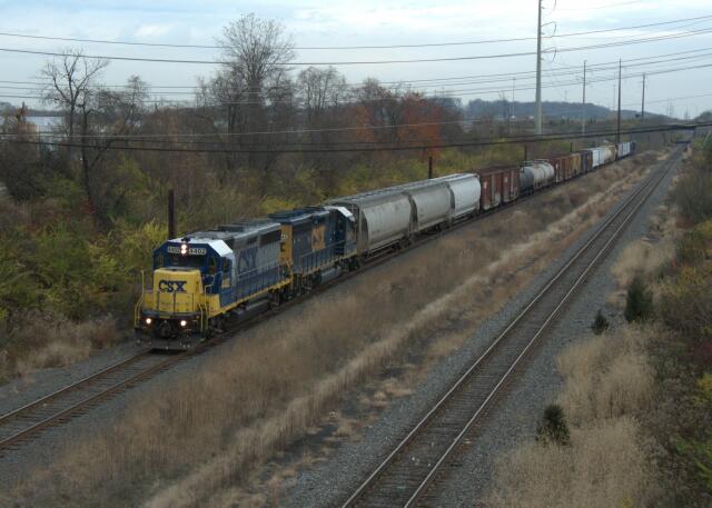 | While the Blue Line Connection is out of service, CSX has been using Woodbourne Yard to interchange cars to and from Lansdale. The night runs are usually push-pull using the SEPTA Main and Neshaminy Lines. Daylight runs are different due to SEPTA not wanting heavy freights on two of their most heavily traveled lines. A typical run has been light engines out of Lansdale down to Jenkintown and up to Woodbourne with the return with cars via the NS Morrisville Line and the Stony Creek Branch. Here CSX B738, with CSX GP40-2 4402 leading, has taken the siding at CP Plymouth to wait at CP King for NS H3A to clear up. |