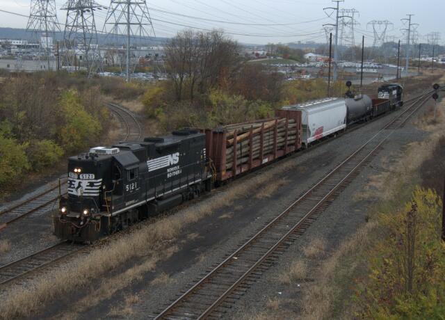 | NS H3A is about to clear CP King and drop off the lumber flat loaded with utility poles on the PECO siding to the left. |