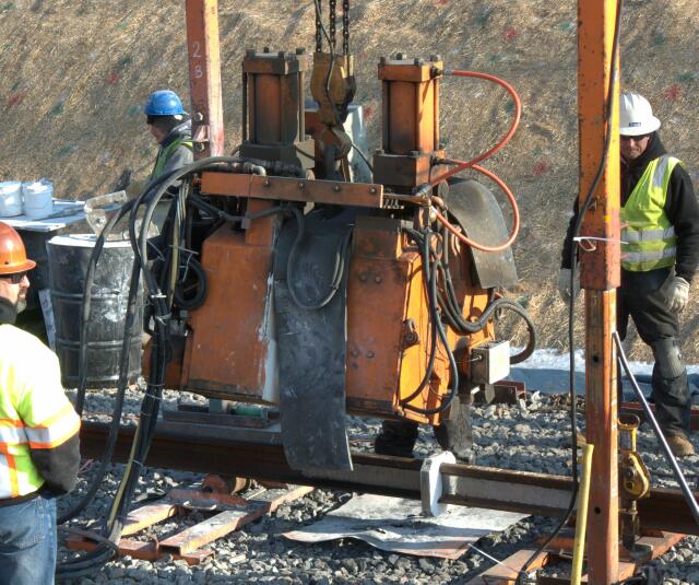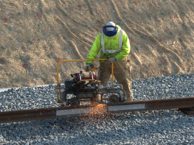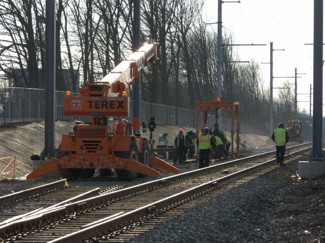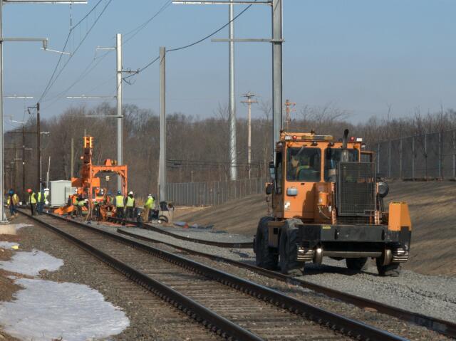 | SEPTA continues work on the new Link Belt Siding. The right of way has been graded and the initial ballast laid down, so the next order of business is getting the rail ready. For smaller segments such as this, instead of dropping continuous welded rail, SEPTA uses a butt welder to create welded rail from sections. |