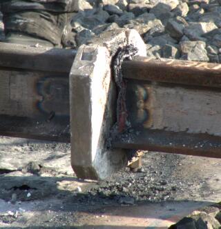 | Each section of rail is lined up and the butt welder is lowered over the joint and the sparks fly. |