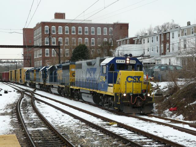 | CSX B738 made a trip from Woodbourne Yard to Lansdale via the NS Morrisville Line and Stony Creek Branch on Monday January 17 2011. CSX GP38-2 2746 leads three more engines as they pull through CP Elm coming off the SEPTA Norristown Line to the Stony Creek Branch ... |