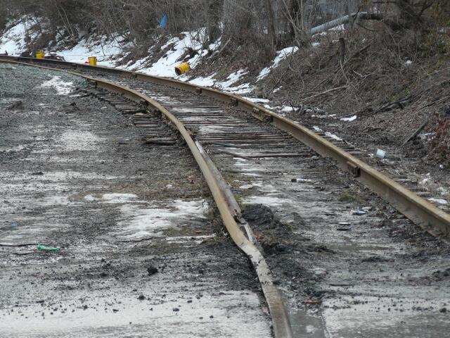| but the track was still mangled. It appeared that the only thing that kept the rail from rolling under the entire trains was the asphalted grade crossing at Sterigere Street. |