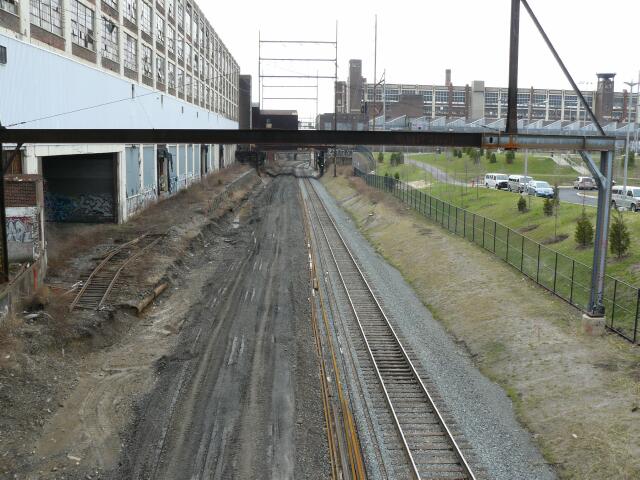 | A little farther east looking west, to the left is a small remnant of one of the Budd Company sidings, all that remains of the rails that served the once bustling factory complex. |