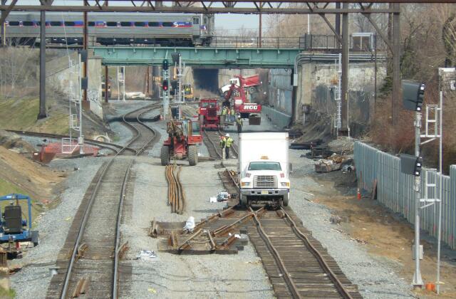 | Looking east from Wissahickon Avenue, new track is being laid. |