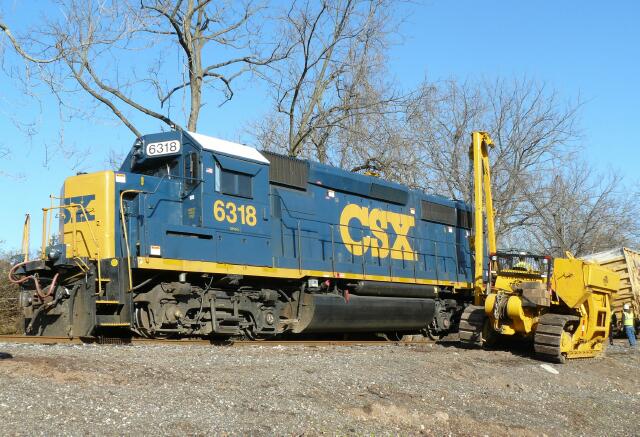 | With the track ahead repaired, the Sidewinders lifted and rerailed the lead truck on 6318. |