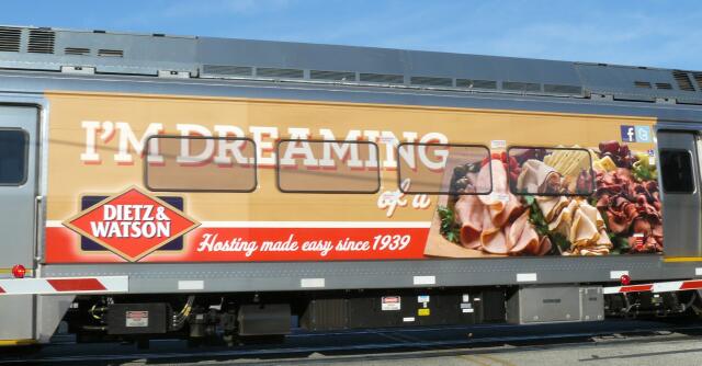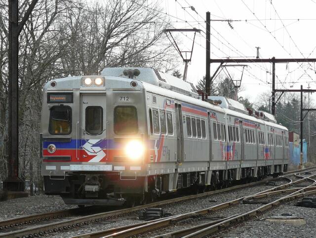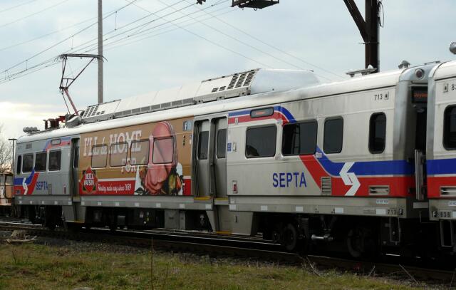 | Silverliner V's have returned to the Doylestown run with Trains 7354/525 in the morning and Trains 562/5253 in the afternoon, and this week they have featured the recently wrapped 712 and 713, adorned with advertisements for Dietz & Watson. Here on January 10 Silverliner V 713 in the trailing unit on 562 as it rolls through Fifth Street in Lansdale. |