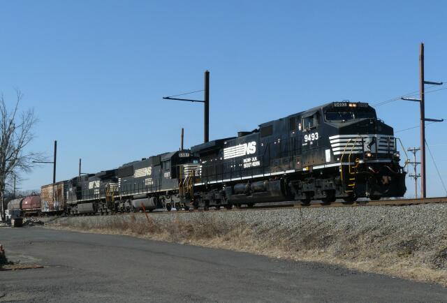 | A lull on the CSX side was interrupted by a train on the NS Morrisville Line, in this case a lunchtime appearance of NS 14G at CP West Lang with the trio of NS D9-40CW 9493, SD60 6587 and D9-40CW 9787. |