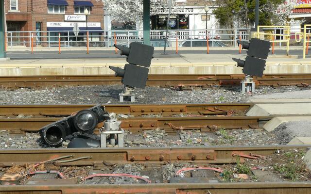 On or about the evening of March 14 and morning of March 15, engine or engines unknown or freight car or freight cars unknown had an unanticipated encounter with the signal for the Bethlehem Industrial Track at Lansdale Station (and not for the first time). The scene of the crime |