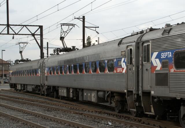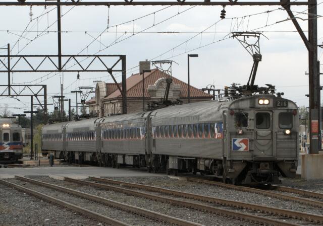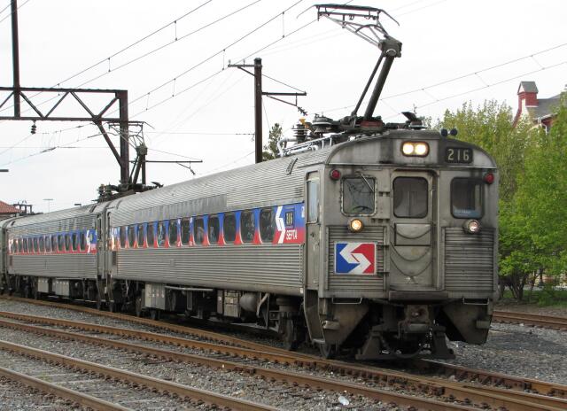 | upon further scrutiny, the lead pair, Silverliner II 216 and Silverliner III 227 are in the usual "pan on the south end" arrangement found on the Reading side ... however ... |
