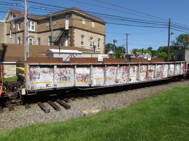 | Included in the consist was gondola SPAX 1103, which is used to collect the old wire. |