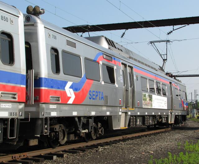 | Meanwhile, over at SEPTA's MU Yard, Silverliner V SPAX 708 sports a more conventional form of advertising ... |