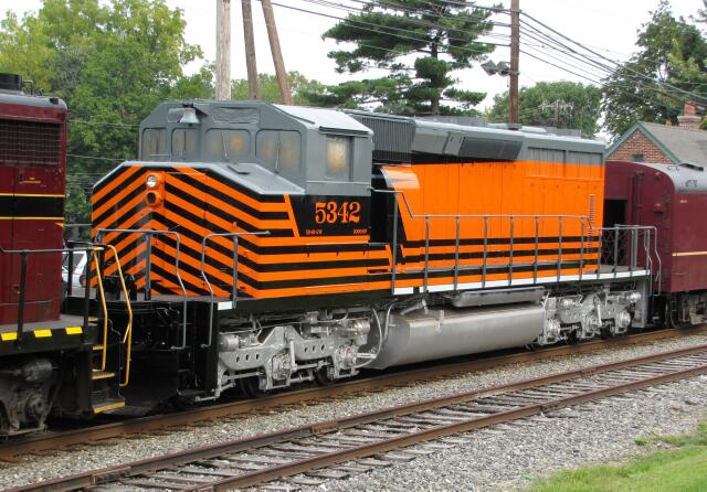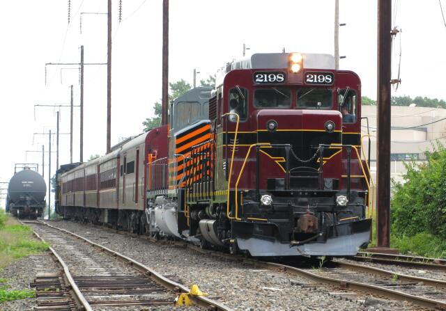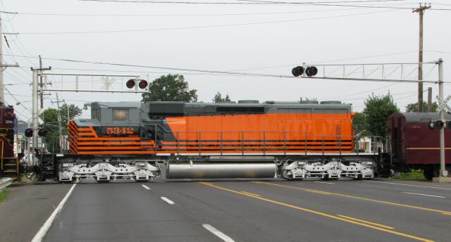 The borough of Lansdale celebrated its 140th birthday with its Founder's Day event featuring tours of public buildings, model railroad displays, information booths and sidewalk sales. The highlight of the day was a special excursion train from New Hope to Lansdale and back. Here the train with ex-PRR GP30 2198 on the head end, pauses while it waits for clearance into Warminster Station. The "special" part of the excursion was the debut of the new Pennsylvania Northeastern Railroad's paint scheme on ex-CN SD40 5342. |