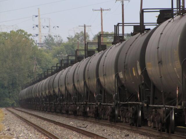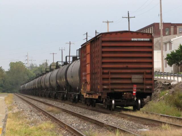 | with a whole lot of loaded tank cars in between. Click here for video on Youtube. |