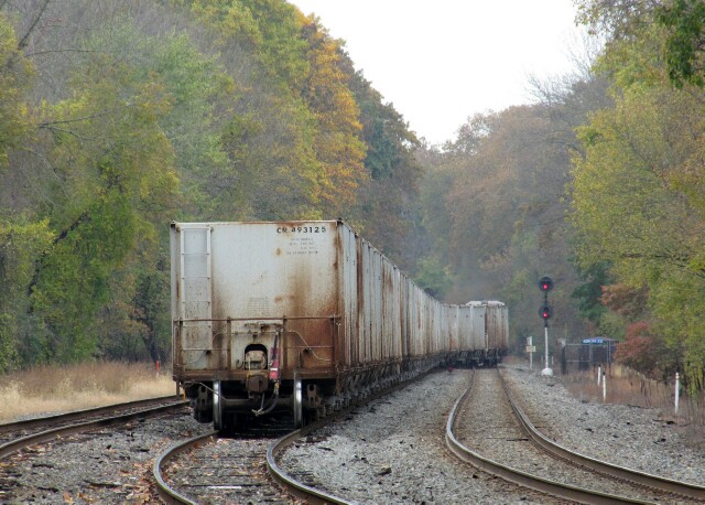 | The cars on the run vary, this time a string of former Conrail H1K hoppers. |
