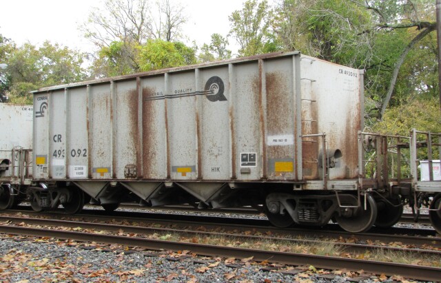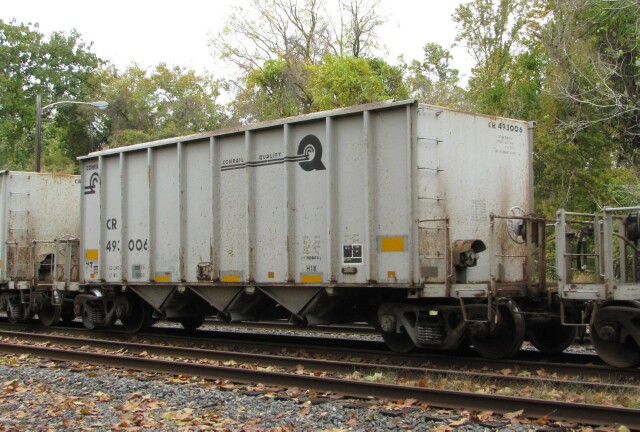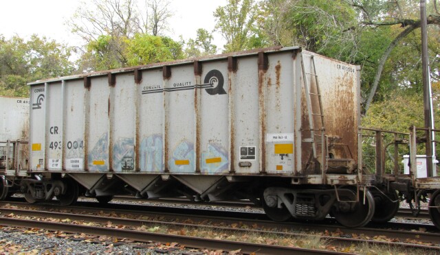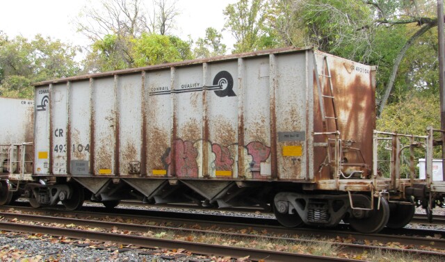 As any modeler will tell you, similar cars show their age at varying degrees, as these twenty year old examples illustrate. Conrail open hopper Class H1K CR 493006 with barely any rust. |