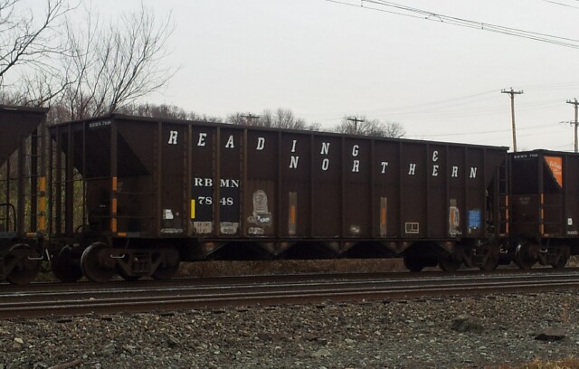 | NS Train 521 pulled a train of empty Reading and Blue Mountain Northern hoppers out of Morrisville, many of the cars like RBMN 7835 marked for "Rio Tinto Coal Service" with an orange triangle on the leftmost side sheet (in a homage to the Reading Company tradition). |