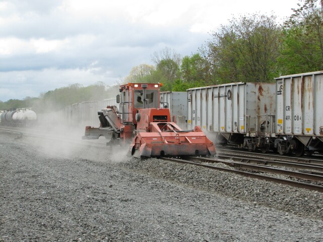 | The train continued west the next day, doing a slow roll past a track gang working a ballast regulator on Track 2 at Abrams. |
