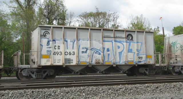 | NS H8E brought a string of empty Conrail H1K ballast hoppers up from Port Richmond but only got as far as Abrams Yard before being told to park it. |