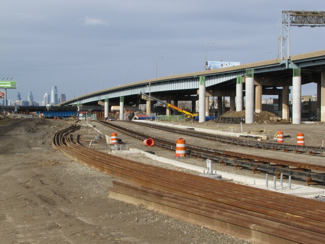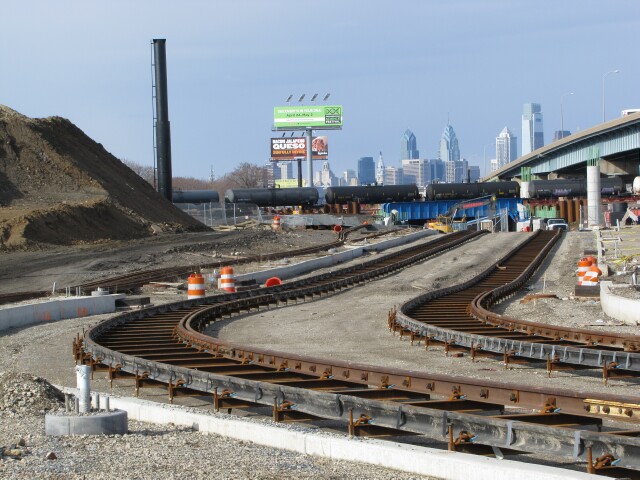 | While the progress of the trolley rails on the south side of the bridges has paused, the SEPTA track gang has turned to laying rail on the north side (compare to September 2014). |