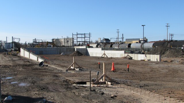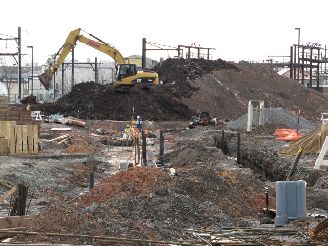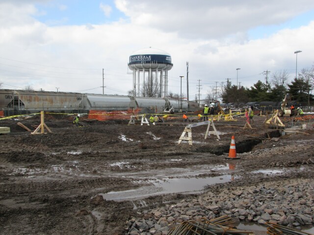 | February 19 2016 Mount Lansdale has reached its peak and now the dirt from the excavations is being hauled offsite as it occupies the route the trucks will take to bring the precast concrete sections to the site when they start arriving sometime in April. |